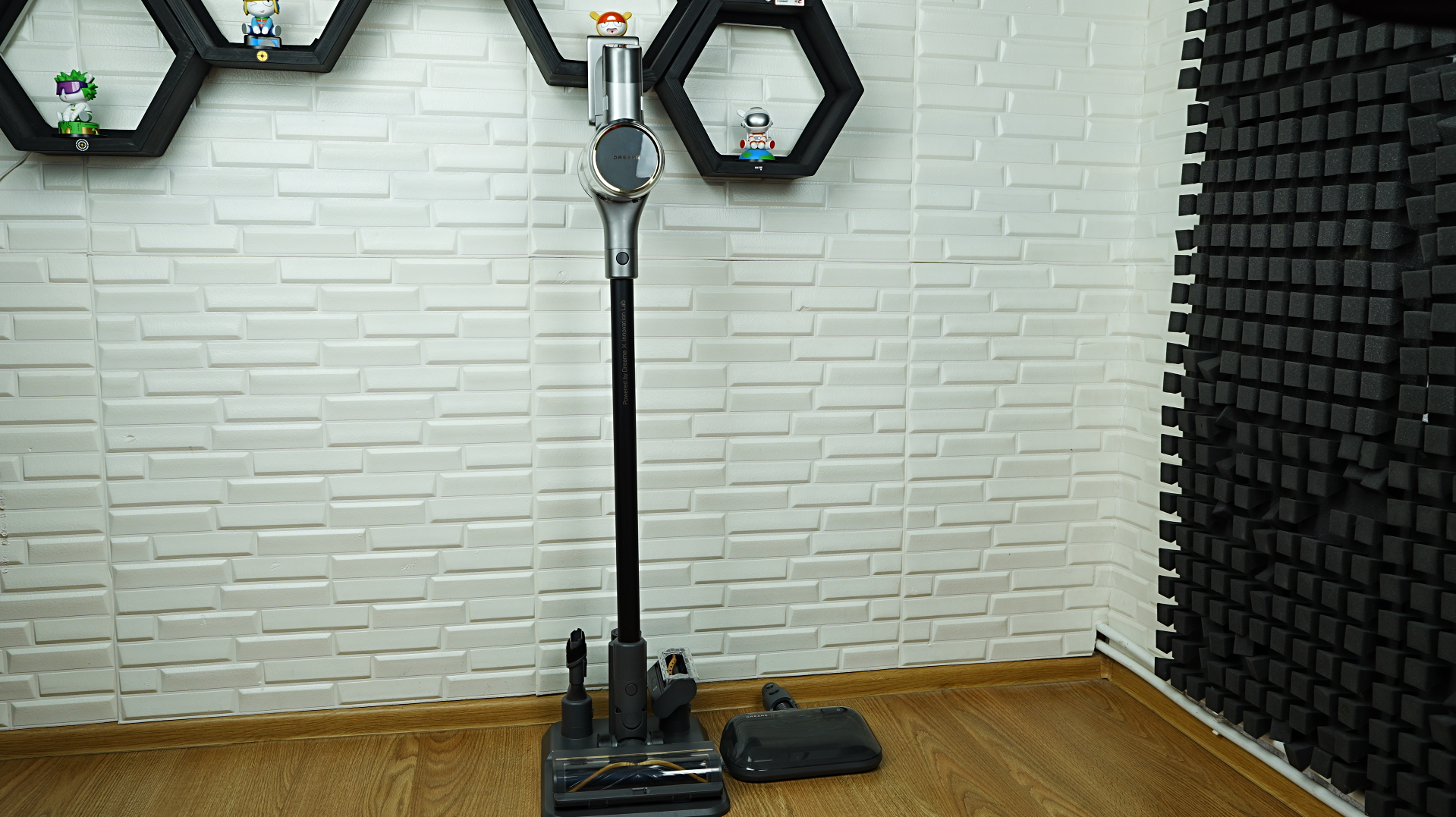 Akumulator o pojemności 2900 mAh zapewnia do 90 minut pracy na jednym ładowaniu, lecz na niskiej prędkości — w trybie turbo jedno ładowanie wystarcza tylko na 7 minut. Na obudowie znajduje się wyświetlacz, który pokazuje informacje o wybranym trybie, poziomie naładowania akumulatora i ewentualnych usterkach. Kolejną zaletą modelu jest stojak podłogowy, na którym wygodnie przechowuje się zarówno odkurzacz, jak i jego akcesoria.