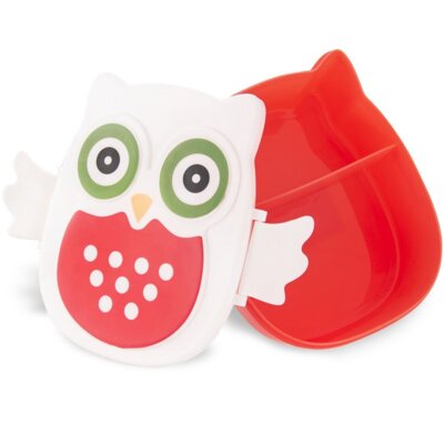Pojemnik śniadaniowy w kształcie sowy. Zamykany na dwa klipsy w kształcie białych skrzydełek. Idealny dla dzieci na drugie śniadanie do szkoły. Posiada dwie przegródki.