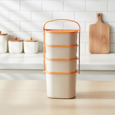 Menażka do przenoszenia żywności. W zestawie 4 pojemniki z pokrywkami oraz stelaż z uchwytem. Wykonana z najwyższej jakości tworzywa. Trzy pojemniki o pojemności 1,15 l oraz jeden 2 l.