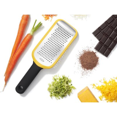 Tarka OXO Good Grips ma wyjątkowo ostrą, trawioną powierzchnię ze stali nierdzewnej, która z łatwością radzi sobie z twardymi i włóknistymi produktami. Szybko zetrzesz świeże składniki, takie jak marc więcej→hew, cukinia, imbir, kokos czy czekolada, by wzbogacić każde danie. Miękki uchwyt zapewnia wygodny chwyt i dodatkową dźwignię, co ułatwia tarcie. Antypoślizgowa stopka stabilizuje tarkę podczas pracy. W zestawie znajduje się również praktyczna osłona ochronna, którą można założyć na tarkę, by chronić dłonie oraz powierzchnię tnącą, gdy nie jest używana. Produkt można myć w zmywarce.