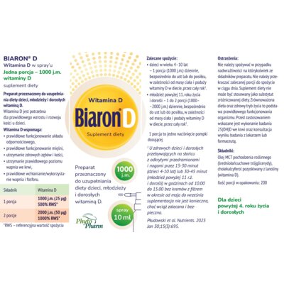 Witamina D BIARON 1000 j.m. Spray B687311 (10 ml)Biaron Witamina D 1000 j.m. w spray’u to źródło witaminy D przeznaczone do codziennego stosowania w okresie jesienno-zimowym oraz przez cały rok dla osób, które nie są w stanie zapewnić dostatecznej ekspozycji na światło słoneczne, w celu utrzymania prawidłowego stężenia witaminy D.Cena od 17 złPorównaj ceny i kup Witamina D BIARON 1000 j.m. Spray B687311(10 ml)Mediaexpert.pl →17 złELECTRO.pl (Polska) →17 złgemini.pl (Polska) →23 złe-ZikoApteka.pl (Polska) →27 złApteka Olmed (Polska) →30 złPorównaj ceny7→