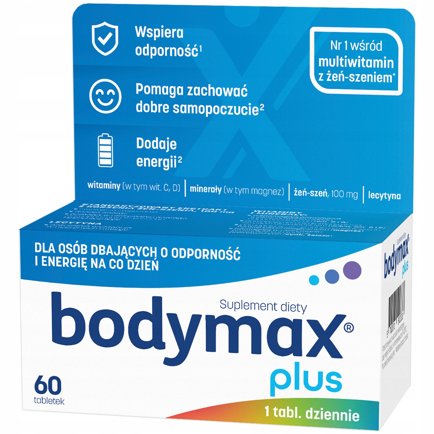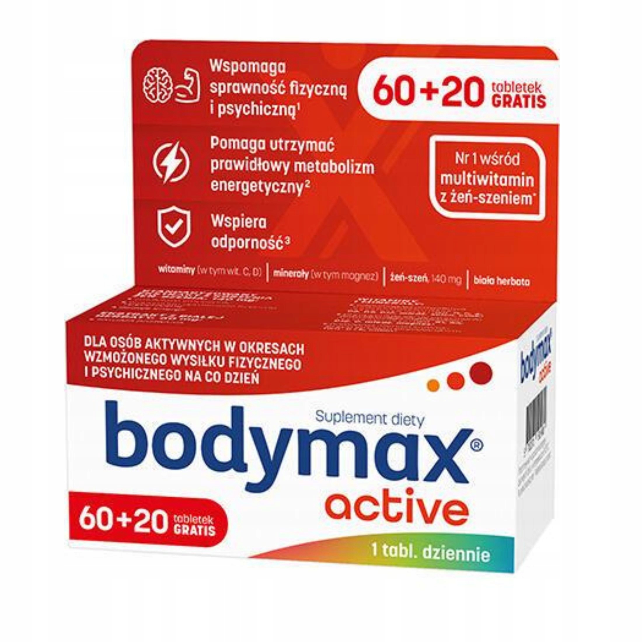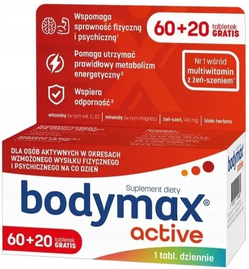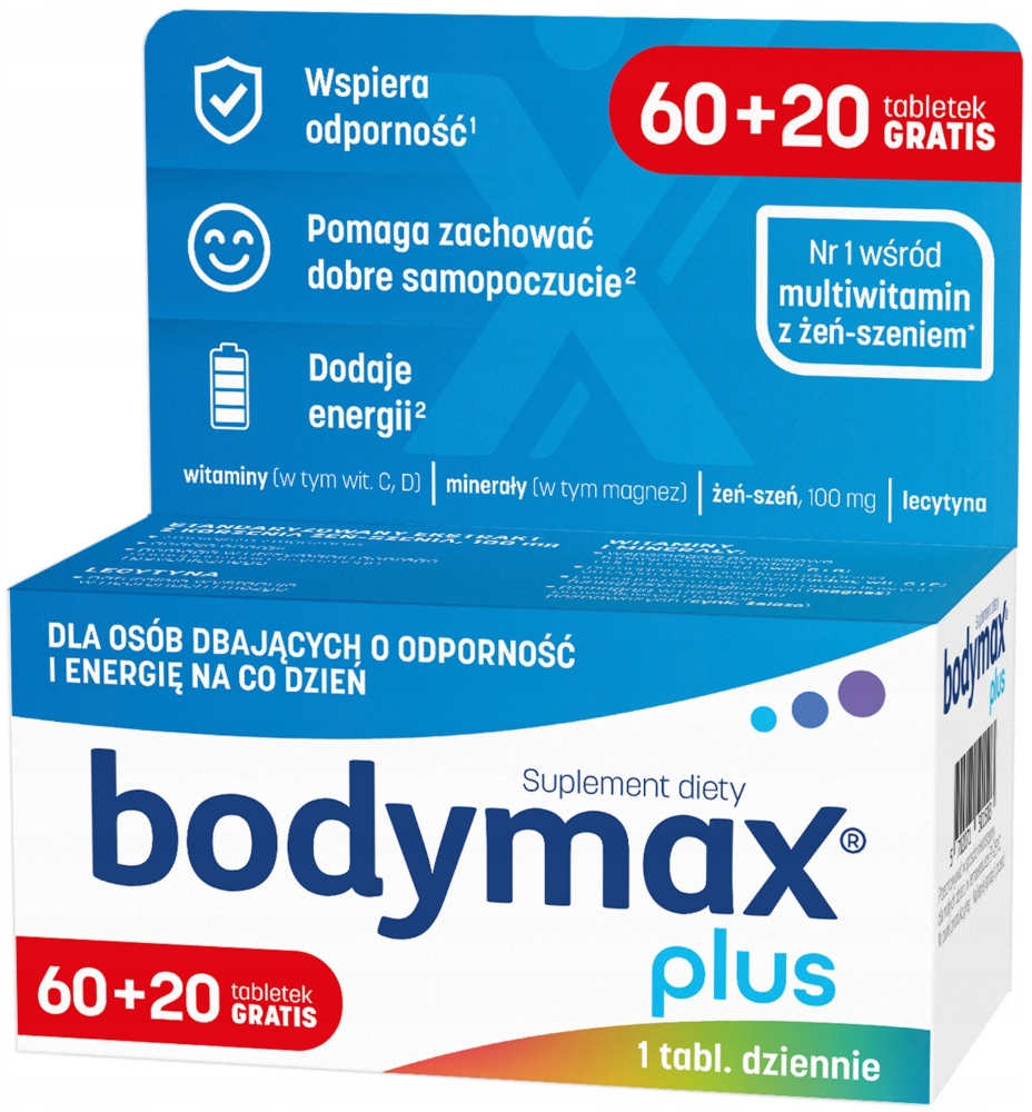 | Bodymax Plus 60+20 TabletekBodymax PLUS to preparat łączący siłę standaryzowanego ekstraktu żeń-szenia z bogatym kompleksem 12 witamin, 6 minerałów i lecytyny. Został stworzony specjalnie dla osób aktywnych na co dzień. Polecany w okresach długotrwałych, nadmiernych wysiłków psychicznych i fizycznych, intensywnej pracy, także w stresie.Składnikiwodorotlenek magnezu, wyciąg z żeń-szenia, L-askorbinian sodu, substancje wypełniające (celuloza mikrokrystaliczna, sól sodowa karboksymetylocelulozy usieciowana), lecytyna (sojowa), fumaran żelaza (II), maltodekstryna, skrobia kukurydziana, substancje glazurujące (sole magnezowe kwasów tłuszczowych, hydroksypropylometyloceluloza, szelak, wosk carnauba), oct… | Cena od 45 złPorównaj ceny i kup Body Max Bodymax Bodymax Plus, Zestaw witamin i minerałów, Tabletki ml Porównaj ceny2→ |