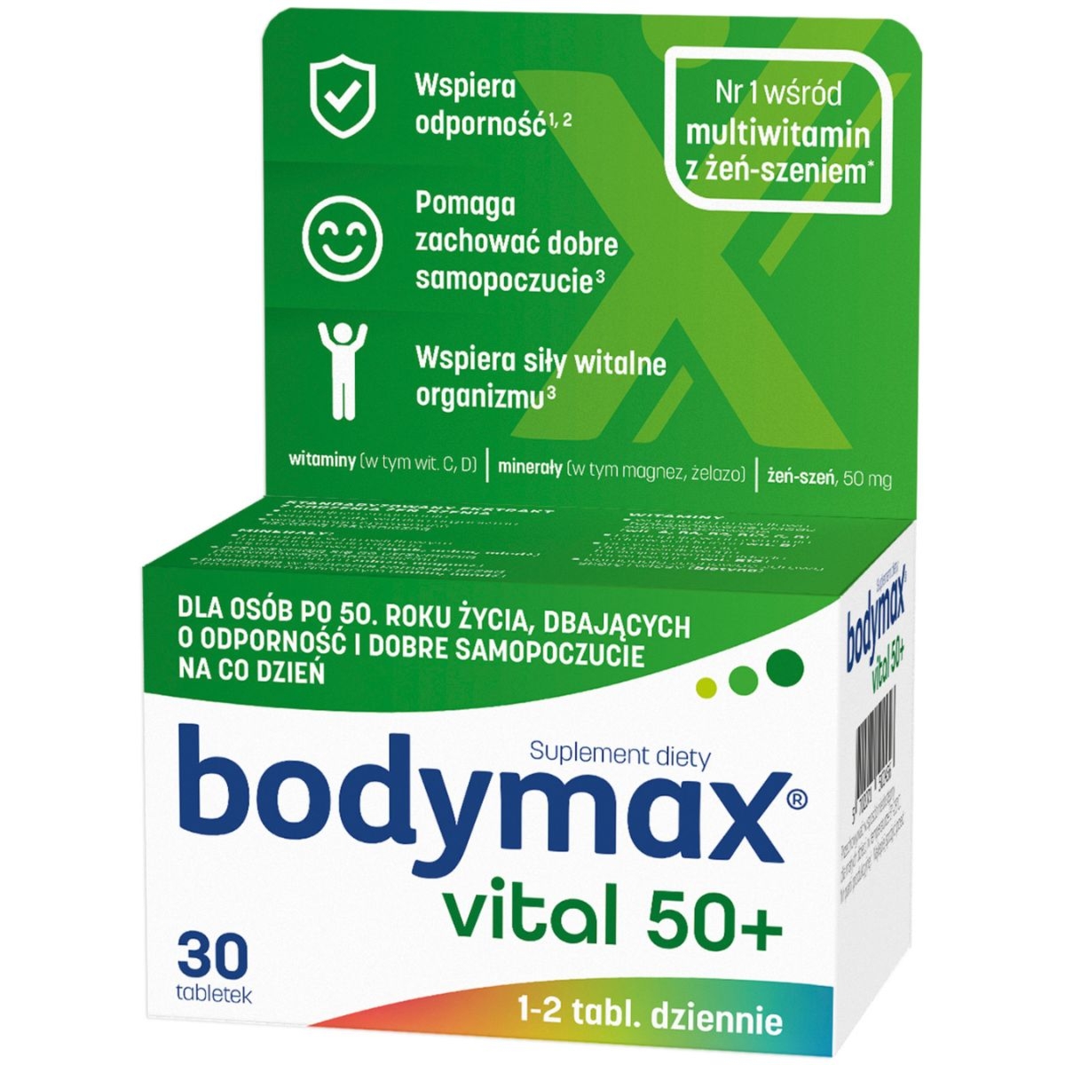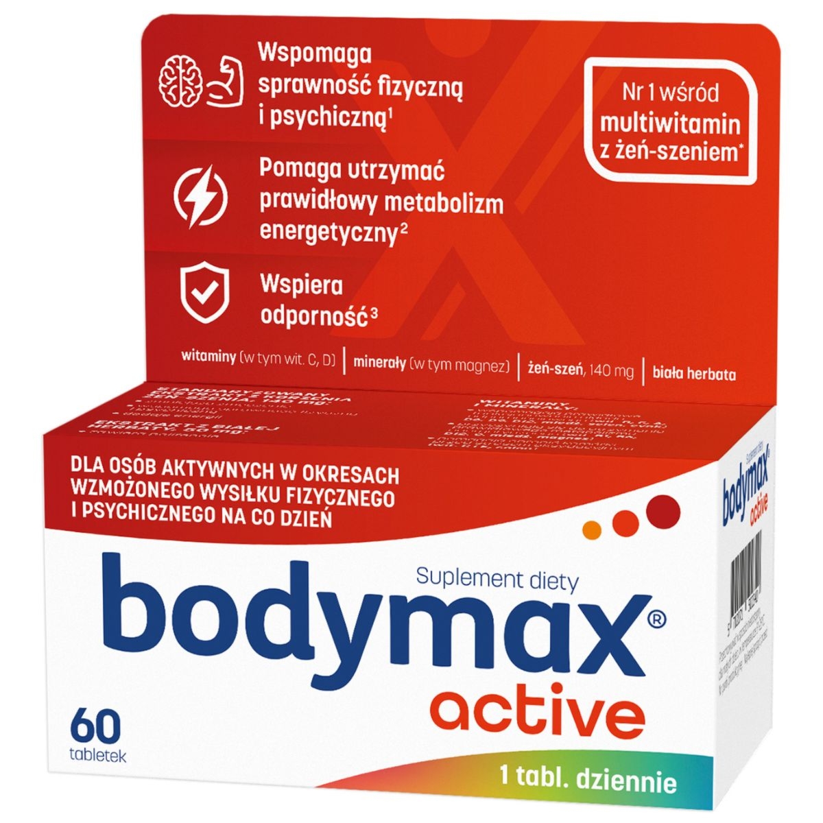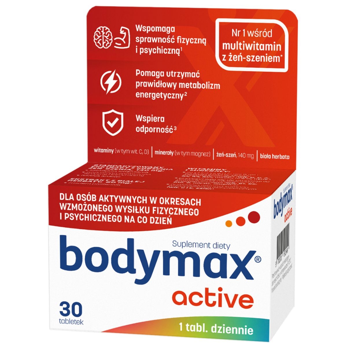 | Bodymax Plus 60+20 TabletekBodymax PLUS to preparat łączący siłę standaryzowanego ekstraktu żeń-szenia z bogatym kompleksem 12 witamin, 6 minerałów i lecytyny. Został stworzony specjalnie dla osób aktywnych na co dzień. Polecany w okresach długotrwałych, nadmiernych wysiłków psychicznych i fizycznych, intensywnej pracy, także w stresie.Składnikiwodorotlenek magnezu, wyciąg z żeń-szenia, L-askorbinian sodu, substancje wypełniające (celuloza mikrokrystaliczna, sól sodowa karboksymetylocelulozy usieciowana), lecytyna (sojowa), fumaran żelaza (II), maltodekstryna, skrobia kukurydziana, substancje glazurujące (sole magnezowe kwasów tłuszczowych, hydroksypropylometyloceluloza, szelak, wosk carnauba), oct… | Cena od 45 złPorównaj ceny i kup Body Max Bodymax Bodymax Plus, Zestaw witamin i minerałów, Tabletki ml Porównaj ceny2→ |