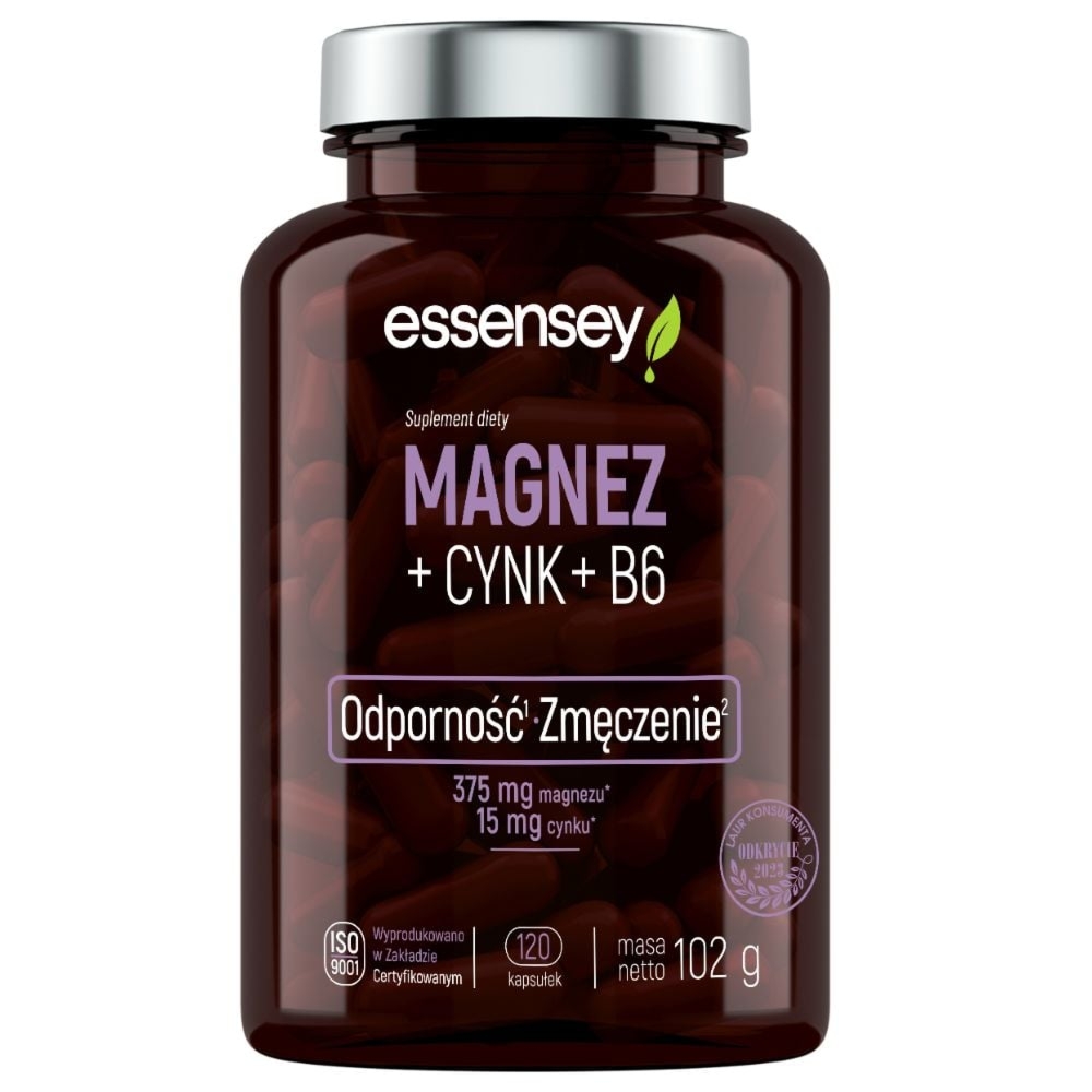 Essensey Magnez + B6 90 kapsułekEssensey suplement diety Magnez + B6Suplement diety Magnez + B6 został stworzony, aby wspierać Twój organizm w wielu kluczowych aspektach. Ta starannie opracowana formuła zawiera cztery formy magnezu (tlenek magnezu, sole magnezowe kwasu cytrynowego, mleczan magnezu, węglan magnezu) oraz witaminę B6, które razem działają na zmniejszenie uczucia zmęczenia i znużenia. Jedna dzienna porcja pokrywa 100% referencyjnych wartości spożycia (RWS) zarówno dla magnezu, jak i witaminy B6. Dzięki zastosowaniu kapsułek celulozowych, produkt jest odpowiedni również dla wegetarian.Kluczowe korzyści regularnej suplementacji:Magnez przyczynia się do zmniejszenia uczucia zmęczenia i znużenia, a także wspiera prawi…Cena od 16 złPorównaj ceny i kup Essensey Magnez + B6 90 kapsułek Drogerienatura.pl →16 złRMN_aptekabrowary.pl (Polska) →16 złApteka Olmed (Polska) →17 złEmpik.com (Polska) →18 złe-ZikoApteka.pl (Polska) →19 złPorównaj ceny8→
