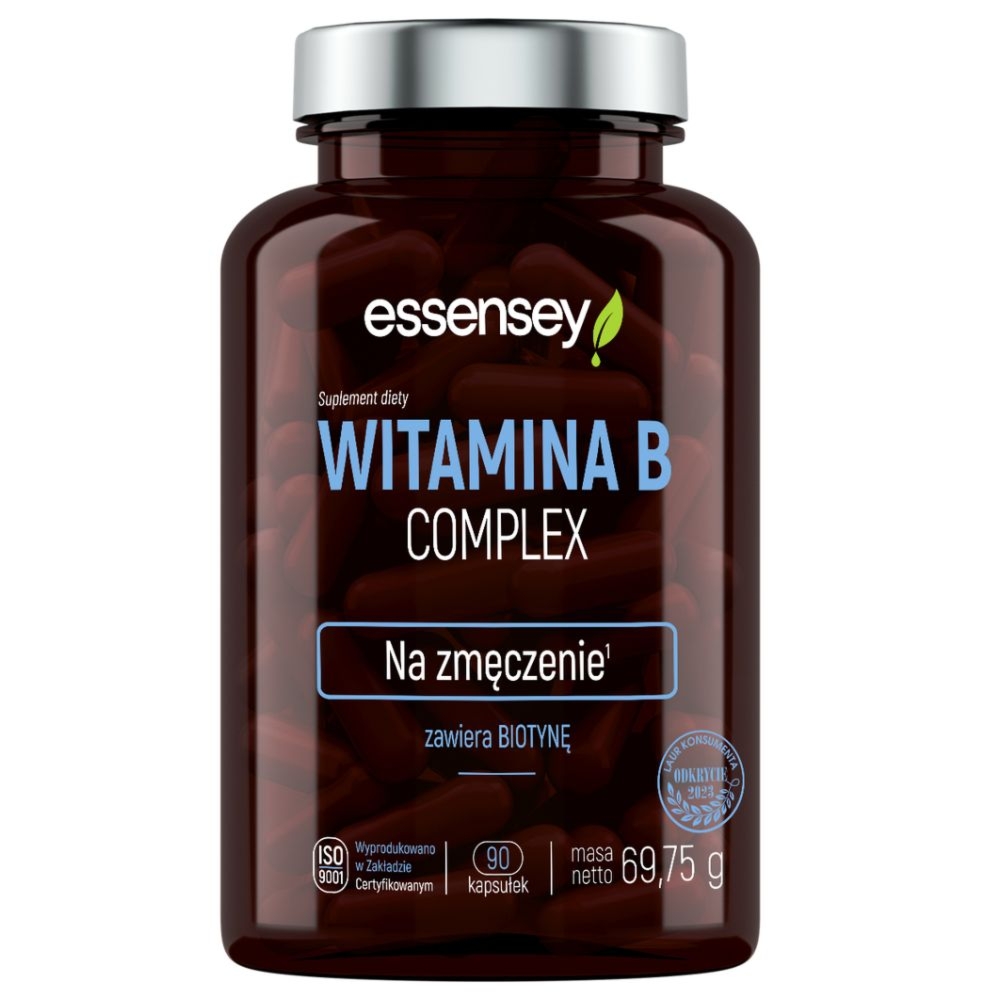 Essensey Witamina B Complex 90 kapsułekEssensey Witamina B Complex suplement dietyEssensey Witamina B Complex to zaawansowany suplement, który dostarcza witaminy z grupy B w formie łatwych do połknięcia kapsułek. Produkt ma przejrzysty skład bez zbędnych dodatków, co zapewnia wysoką jakość i skuteczność.Działanie i składniki aktywneTen kompleks witaminowy wspiera wiele kluczowych funkcji organizmu:Zmniejszenie zmęczenia: Ryboflawina, niacyna, witaminy B6 i B12 pomagają w walce ze znużeniem, dodając energii do codziennych działań.Wsparcie procesów energetycznych: Tiamina, ryboflawina, witaminy B6, B12 i biotyna uczestniczą w prawidłowym przebiegu metabolizmu energetycznego organizmu.Zachowanie sprawności umysłowej: Kwas pantotenowy wspiera u…Cena od 25 złPorównaj ceny i kup Essensey Witamina B Complex 90 kapsułek Drogerienatura.pl →25 złAmazon.pl →30 złFrisco.pl →33 złPorównaj ceny3→