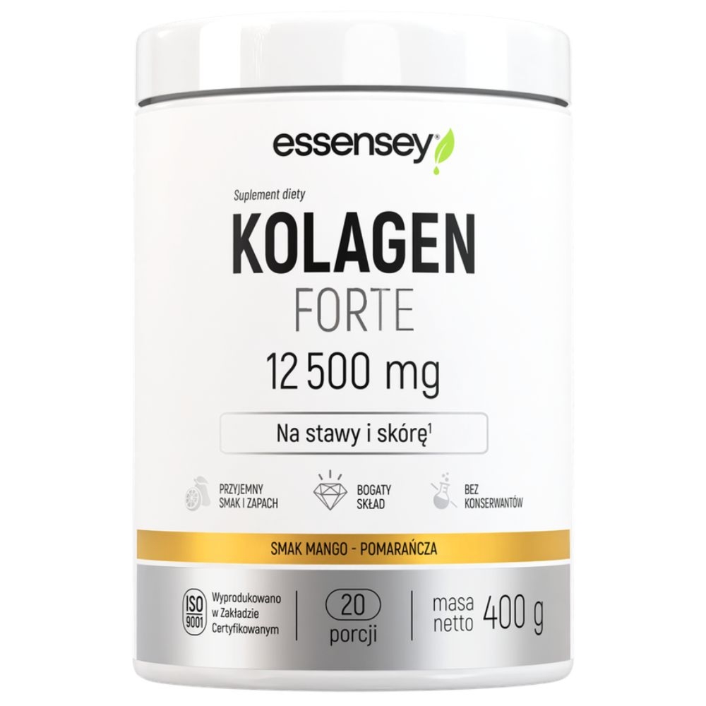 Essensey Kolagen Forte 12500 mg Mango Pomarańcza 400 gEssensey Kolagen Forte 12 500 mg – Mango-Pomarańcza (400 g)Suplement diety w formie łatwo rozpuszczalnego proszku o orzeźwiającym smaku mango-pomarańcza. Formuła produktu bazuje na wysokiej jakości hydrolizacie kolagenu wołowego, dostarczając aż 12 500 mg tego składnika w każdej porcji. Skład został precyzyjnie uzupełniony o kompleks substancji aktywnych, w tym siarczan glukozaminy, MSM, siarczan chondroityny, witaminę C oraz kwas hialuronowy.Produkt jest dedykowany osobom aktywnym fizycznie oraz prowadzącym intensywny tryb życia, stanowiąc wartościowe uzupełnienie codziennej, zbilansowanej diety.Kluczowe właściwości:Wysoka dawka kolagenu: Koncentracja 12 500 mg hydrolizowanego kolagenu wołowego SOLUGEL™…Cena od 65 złPorównaj ceny i kup Essensey Kolagen Forte 12500 mg Mango Pomarańcza 400 g Drogerienatura.pl →65 złFrisco.pl →76 złPorównaj ceny2→