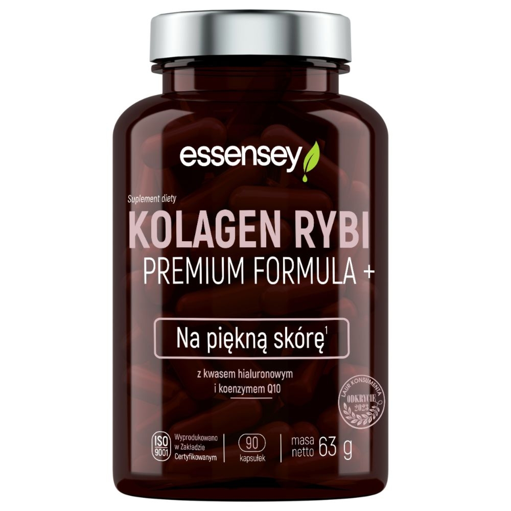 Essensey Kolagen Rybi Premium Formula+ 90 kapsułekEssensey Kolagen Rybi Premium Formula+ suplement dietySuplement diety Essensey Kolagen Rybi Premium Formula+ to produkt stworzony z myślą o osobach, które chcą kompleksowo zadbać o wygląd skóry oraz wspierać kondycję kości i chrząstki.Kluczowe składniki i ich działanieSuplement dostarcza 1000 mg hydrolizatu kolagenu rybiego w dziennej porcji. Formuła produktu jest wzbogacona o cztery dodatkowe składniki aktywne: kwas hialuronowy, koenzym Q10, witaminę C oraz witaminę A.Witamina C wspiera produkcję kolagenu, co jest kluczowe dla prawidłowego funkcjonowania skóry, kości i chrząstki. Dodatkowo pomaga w ochronie komórek przed stresem oksydacyjnym.Witamina A przyczynia się do utrzymania zdrowej sk… 50 złDrogerienatura.plZłóż skargęKup!