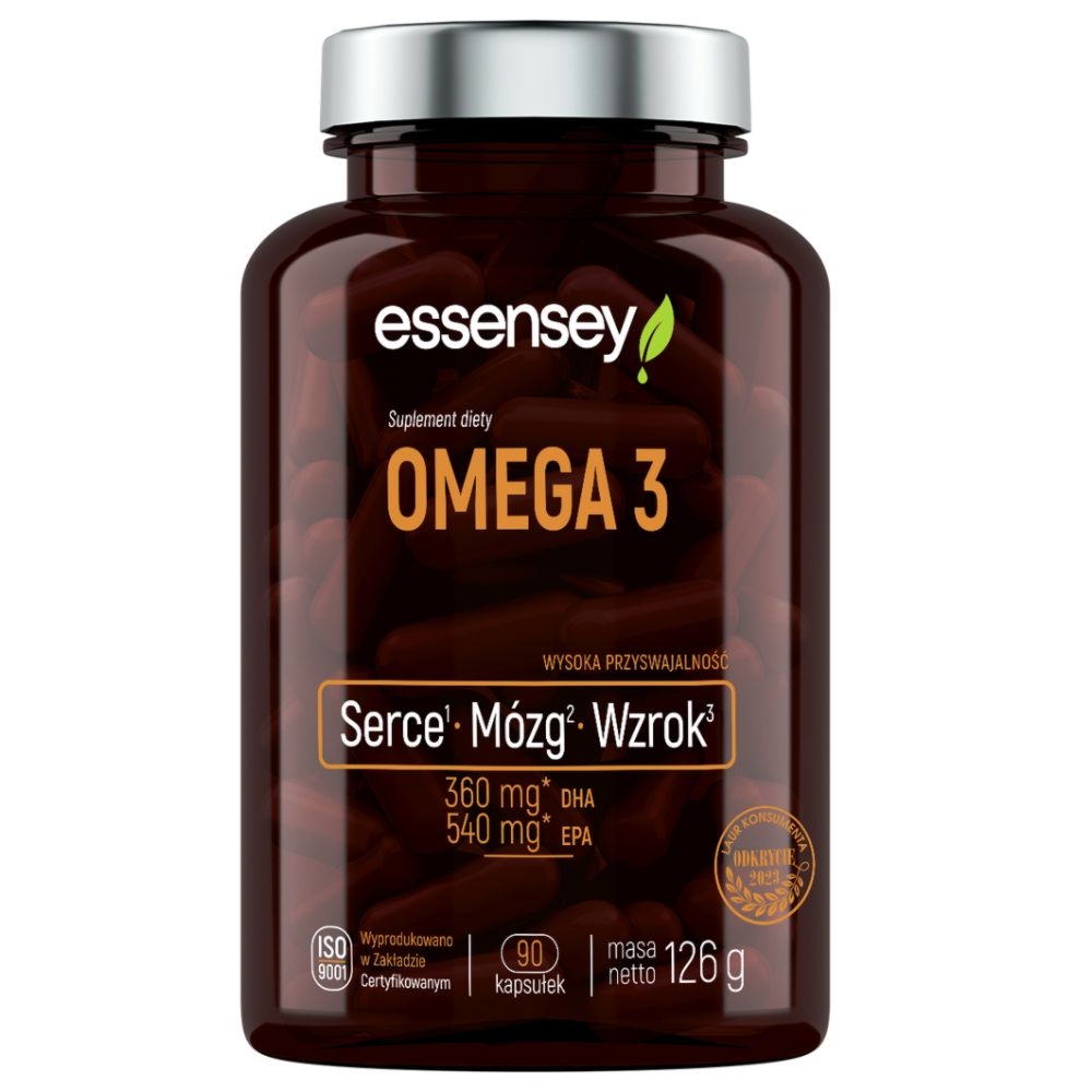 Essensey Omega 3 90 kapsułekEssensey Omega 3 suplement diety - Naturalne Źródło Kwasów EPA i DHASuplement diety Essensey Omega 3 to wysokiej jakości olej rybi, stanowiący skoncentrowane, naturalne źródło niezbędnych nienasyconych kwasów tłuszczowych omega-3: eikozapentaenowego (EPA) oraz dokozaheksaenowego (DHA). Formuła produktu charakteryzuje się czystym i przejrzystym składem, wolnym od zbędnych dodatków. Dla wzmocnienia działania, skład został wzbogacony o witaminę E, która jako silny antyoksydant pomaga w ochronie komórek przed stresem oksydacyjnym.Regularne dostarczanie organizmowi kwasów EPA i DHA wspiera prawidłowe funkcjonowanie serca i układu krążenia. Kwas DHA odgrywa również kluczową rolę w utrzymaniu prawidłowego …Cena od 25 złPorównaj ceny i kup Essensey Omega 3 90 kapsułek Drogerienatura.pl →25 złFrisco.pl →25 złAmazon.pl →30 złPorównaj ceny3→