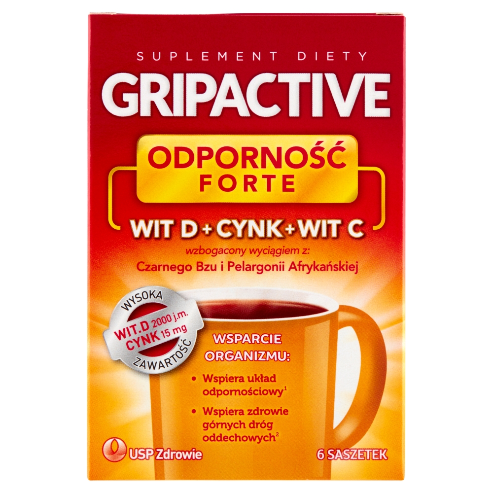Forte GRIPACTIVE Suplement diety Wit. D + Cynk + Wit. C (6 sasztek)Gripactive Odporność Forte to suplement diety wspomagający układ odpornościowy, zdrowie dróg oddechowych. W jednej saszetce znajduje się aż 1000 mg Witaminy C. Stosowanie produktu rekomenduje się osobom dorosłym. Preparat jest w wygodnych do stosowania, jednoporcjowych saszetkach z proszkiem, z którego przyrządza się napój do picia o właściwościach rozgrzewających. W 1 saszetce znajduje się: Ekstrakt z kwiatu czarnego bzu - 300 mg (1206% RWS*), Ekstrakt z owocu dzikiej róży - 57,14 mg (w tym witamina C - 40 mg (50% RWS*)), Ekstrakt z korzenia pelargonii afrykańskiej - 15 mg, Cynk - 15 mg, Witamina D - 50 µg (1000% RWS*). *RWS - Referencyjna Wartość Spożycia. Opakowanie zawiera 6 saszetek. 17 złMamyito.plDostawa: w Polsce Złóż skargęKup!