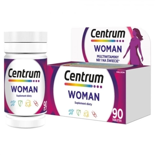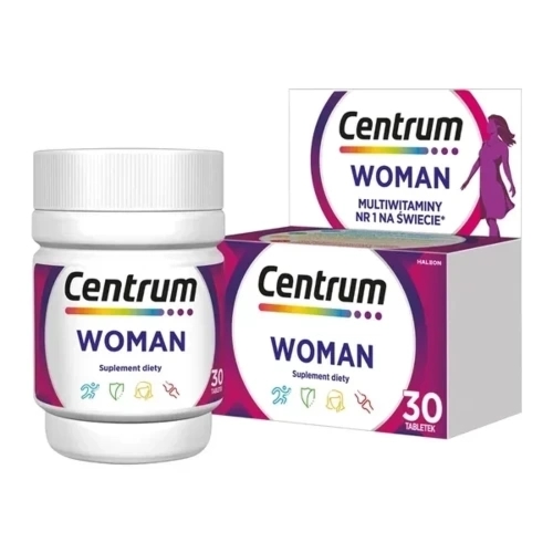 Centrum WOMAN x 30 tabletekWitamina E, witamina D, witamina A, witaminy z grupy B, kwas foliowy, żelazo, wapń oraz wiele innych witamin i minerałów tworzy skład suplementu diety Centrum Woman. Preparat do stosowania jako uzupełnienie diety dorosłych kobiet w cenne składniki. 55 złi-apteka.plZłóż skargęKup!