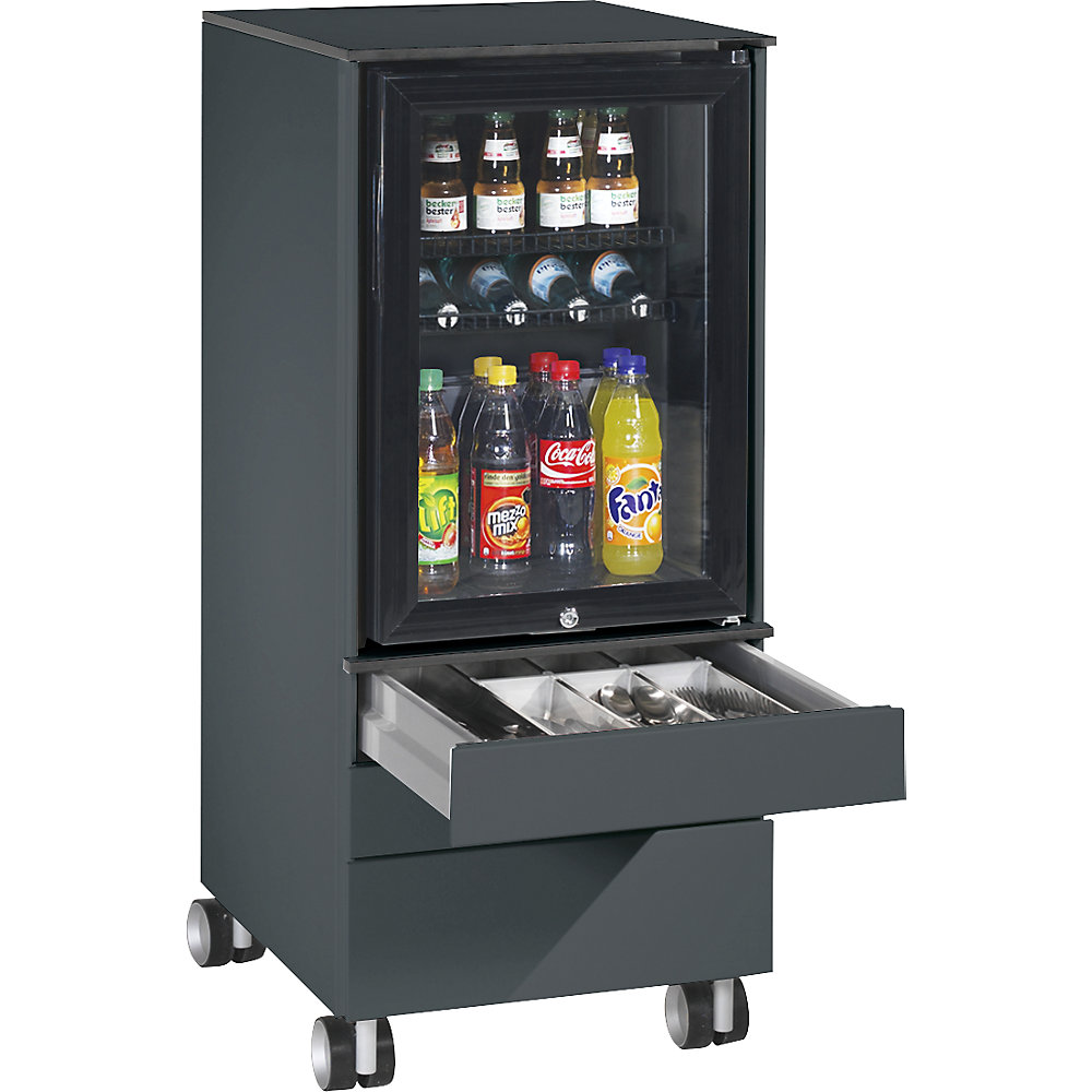 C+P Lodówka Caddy ASISTO16 470Kup!złKaiserkraft.plZłóż skargęLodówka Caddy ASISTO, na rolkach, RAL 7021 czarno-szary. Dostawa = zmontowane/w całości. Wysokość = 1157 mm. Szerokość = 430 mm. Głębokość = 600 mm. Materiał korpusu = stal, lakierowana. Kolor korpusu więcej→= czarno-szary, RAL 7021. Wyposażenie = lodówka (3 przegrody), szuflady z miejscem na sztućce, wkładem na drobne części i miejscem na filiżanki i szklanki. Liczba szuflad = 3 szt. Oświetlenie = z oświetleniem. Całkowita moc przyłączeniowa = 85 W. Poj. lodówki = 62 l. Klasa wydajności energetycznej = D (spektrum A do G). Rodzaj produktu = wyposażenie dodatkowe do cateringu. Emisja hałasu 56 dB, roczne zużycie energii ok. 347 kWh, klasa energetyczna D. Nośność szuflad 40 kg. Na rolkach. Lodówka Caddy…