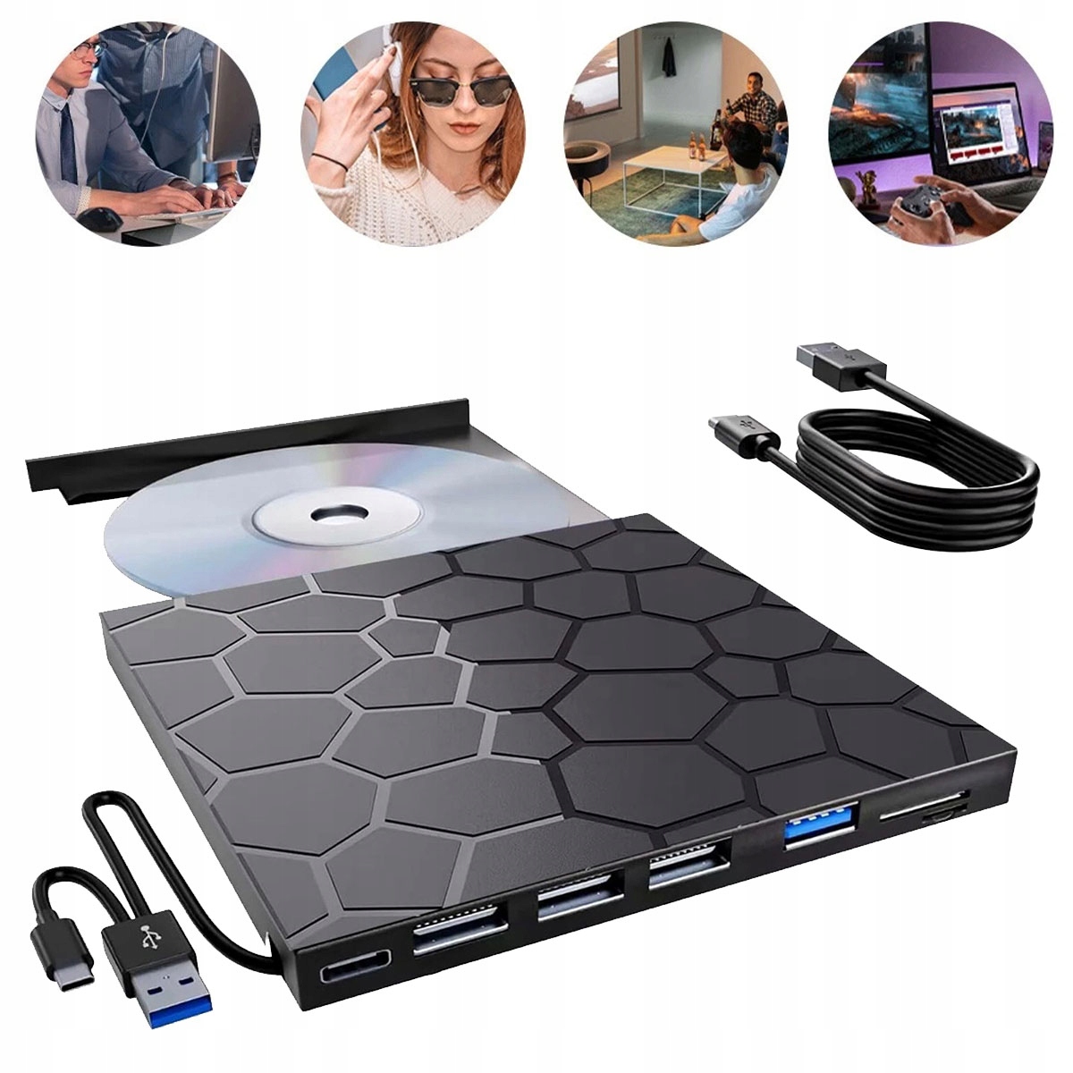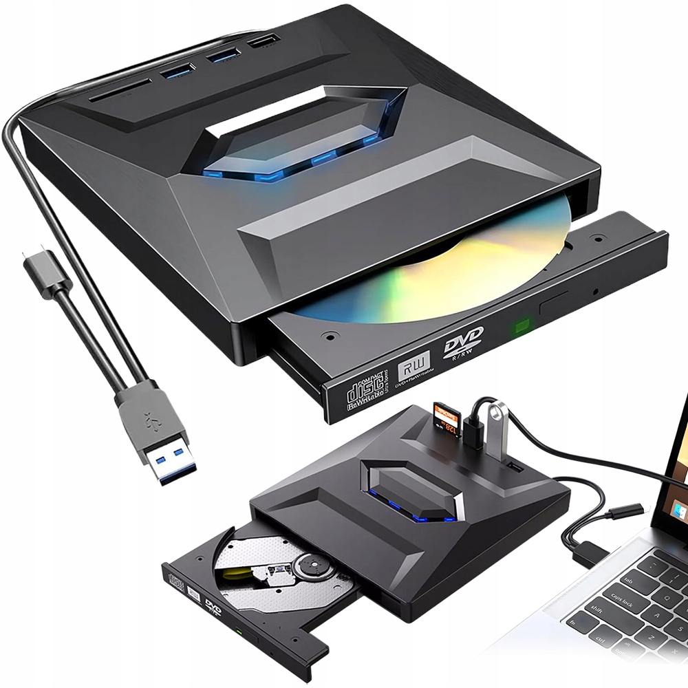 — pełnowymiarowy port USB z prędkością przesyłu danych do 5 Gb/s. Taka prędkość daje napędowi dobry zapas przepustowości, dlatego przy odczycie i zapisywaniu płyt interfejs zazwyczaj nie staje się wąskim gardłem, a urządzenie działa pewniej z nowoczesnymi komputerami i laptopami.Główna praktyczna korzyść polega nie na tym, że płyty same w sobie zaczynają „obracać się szybciej niż norma”, lecz na tym, że połączenie pozostaje stabilne i z zapasem dla zasilania oraz wymiany danych.