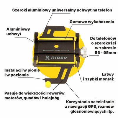 X-RIDER Uchwyt na telefon do roweru XRIDER XR00PH01od 50 złPorównaj ceny5→Uniwersalny, szeroki uchwyt aluminiowy do mocowania telefonu na kierownicy rowerowej. Kompatybilność z większością rowerów, motocykli, quadów i hulajnóg. Możliwość montażu w orientacji pionowej lub poziomej.