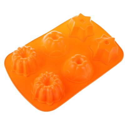 — silikon spożywczy jest jednym z najpopularniejszych materiałów wśród wszystkich rodzajów form do pieczenia. Pod względem wyglądu i właściwości materiał ten przypomina gumę - w szczególności jest miękki i sprężysty. Jednak w przeciwieństwie do gumy silikon spożywczy jest bardzo odporny na ciepło - bez konsekwencji toleruje temperatury pracy nowoczesnych piekarników (chociaż konkretne ograniczenie temperatury nie zaszkodzi wyjaśnić osobno, nie wszystkie rodzaje silikonu "czują się dobrze" w 250°C albo więcej). Takie produkty są bezsmakowe i bezwonne, chemicznie obojętne (nie wydzielają żadnych substancji podczas użytkowania) i są łatwe w utrzymaniu czystości. W większości przypadków takie formy nie wymagają smarowania, gotowane jedzenie nie przykleja się do nich; a miękkość pozwala na łatwe wyjmowanie gotowych potraw z foremek. Zauważamy również, że materiał ten jest absolutnie niewrażliwy na wstrząsy, upadki, naciski i inne podobne problemy; z wyjątkiem tego, że ostre przedmioty dość łatwo go uszkadzają, ale nawet to może wymagać bardzo niefortunnej kombinacji okoliczności. Jednak produkty silikonowe są niedrogie i często występują w jasnych, atrakcyjnych kolorach.