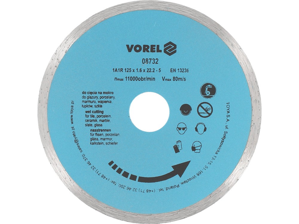 Vorel diamentowa 230 mm, segment ciągły do glazury, marmuru 0.7kg 08735od 19 złPorównaj ceny5→Tarcza diamentowa do szlifierek kątowych. wyposażona w segment ciągły o wysokości 5 mm Przeznaczona do pracy „na mokro”. Polecana do cięcia płytek ceramicznych, glazurowanych materiałów budowlanych, s więcej→zkła, marmuru itp. zalecane obroty ok.6500 /min