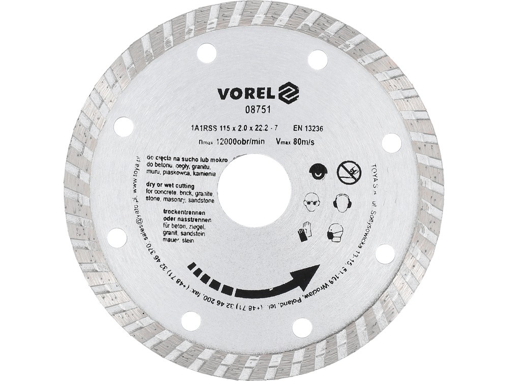 Vorel diamentowa 115 mm, segment turbo do glazury, marmuru 0.15kg 08751od 5 złPorównaj ceny5→Tarcza diamentowa uniwersalna do szlifierek kątowych. Wyposażona w segment ciągły typu turbo wysokości 7 mm Przeznaczona do pracy „na mokro lub na sucho'. Polecana do cięcia betonu cegieł, kamienia i więcej→innych materiałów budowlanych. zalecane obroty ok. 12000/min
