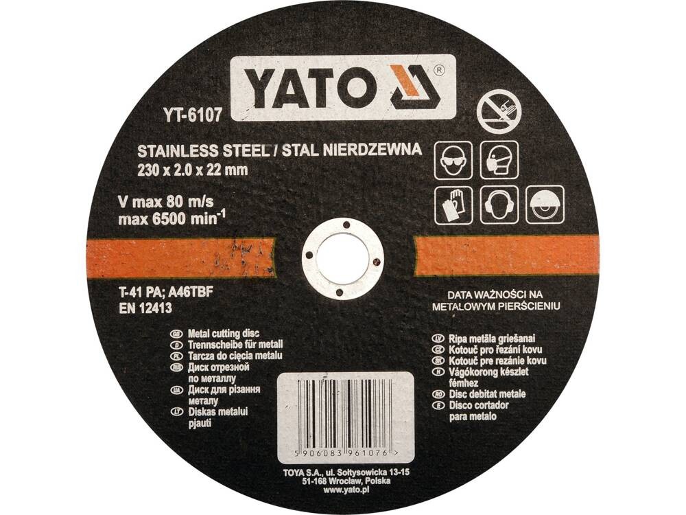 Yato do cięcia stali nierdzewnej 230x1.9x22 mm yt-6107 0.21kg YT-6107od 4 złPorównaj ceny6→Tarcza do cięcia stali nierdzewnej przeznaczona do skutecznej obróbki stali szlachetnych oraz zwykłych. tarcza na spoiwie żywicznym wzmacniana włóknem szklanym charakteryzuje się dużą wydajnością cięc więcej→ia przy niskim zużyciu tarczy Do współpracy z typowymi szlifierkami kątowymi.