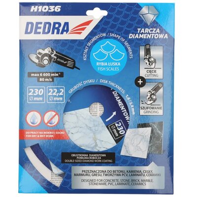 Dedra do cięcia H1036 230 mmod 180 złPorównaj ceny5→Tarcza diamentowa z segmentem typu łuska jest przeznaczona do cięcia na mokro i sucho, doskonale radząc sobie z obróbką różnych materiałów. Sprawdzi się przy cięciu betonu, kamienia, cegły, marmuru, g więcej→resu, tworzyw PCV, laminatu oraz ceramiki. Dzięki swojej wszechstronności jest niezastąpiona zarówno w budownictwie, jak i podczas remontów czy prac wykończeniowych. Unikalny kształt segmentów przypominających rybią łuskę usprawnia chłodzenie tarczy w trakcie pracy, co ogranicza ryzyko przegrzania i wydłuża czas efektywnego cięcia. Konstrukcja ta umożliwia mniej agresywne cięcie, co czyni ją odpowiednią do pracy z delikatniejszymi materiałami. Dodatkowo większa powierzchnia styku segmentów z obr…