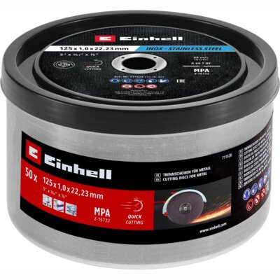 Einhell do cięcia 49711528 125 mm (50 szt.)od 100 złPorównaj ceny9→Zestaw 50 wysokiej jakości tarcz do metalu 125 × 1,0 mm, posiadających certyfikat MPA, zapewniających maksymalne bezpieczeństwo i niezawodność podczas pracy.