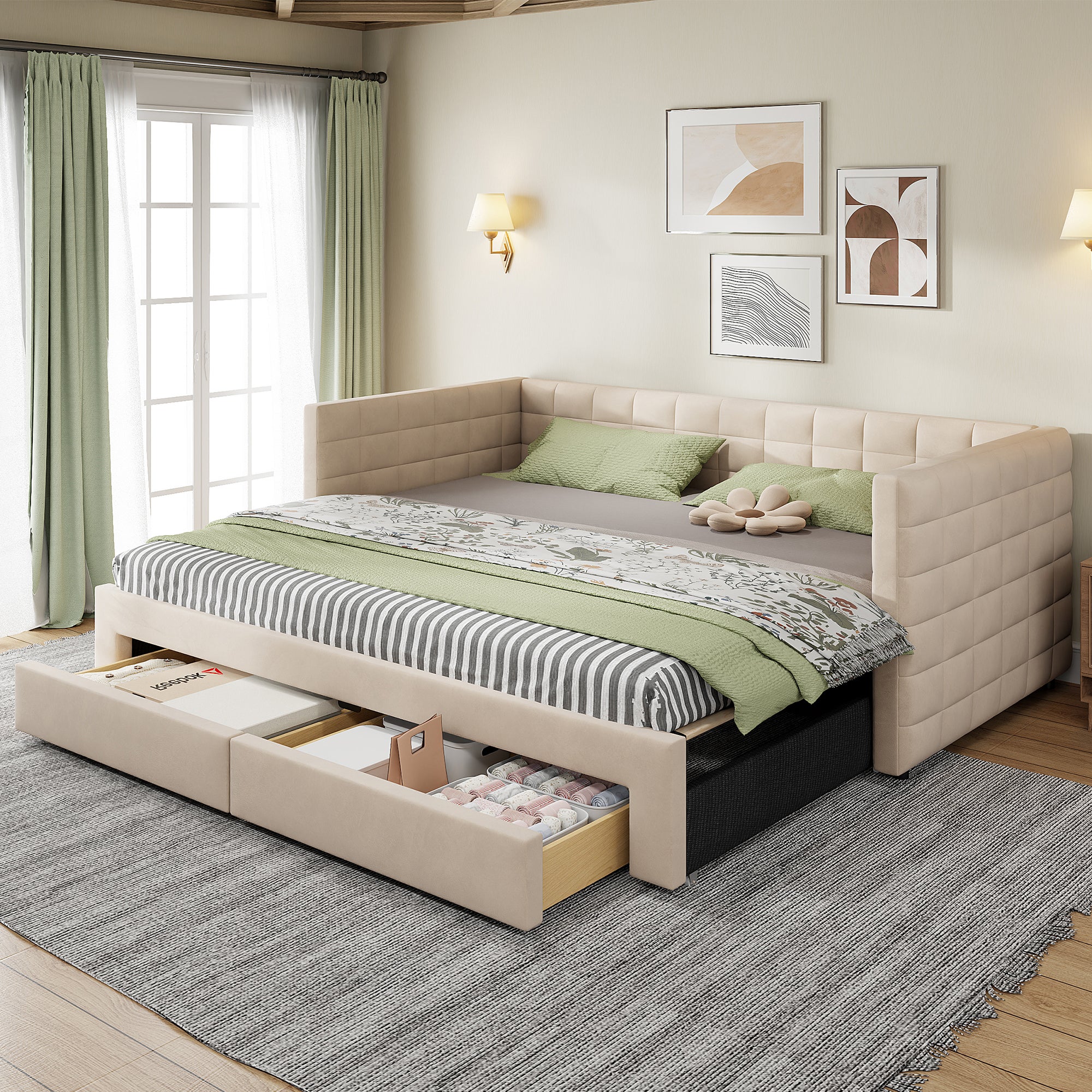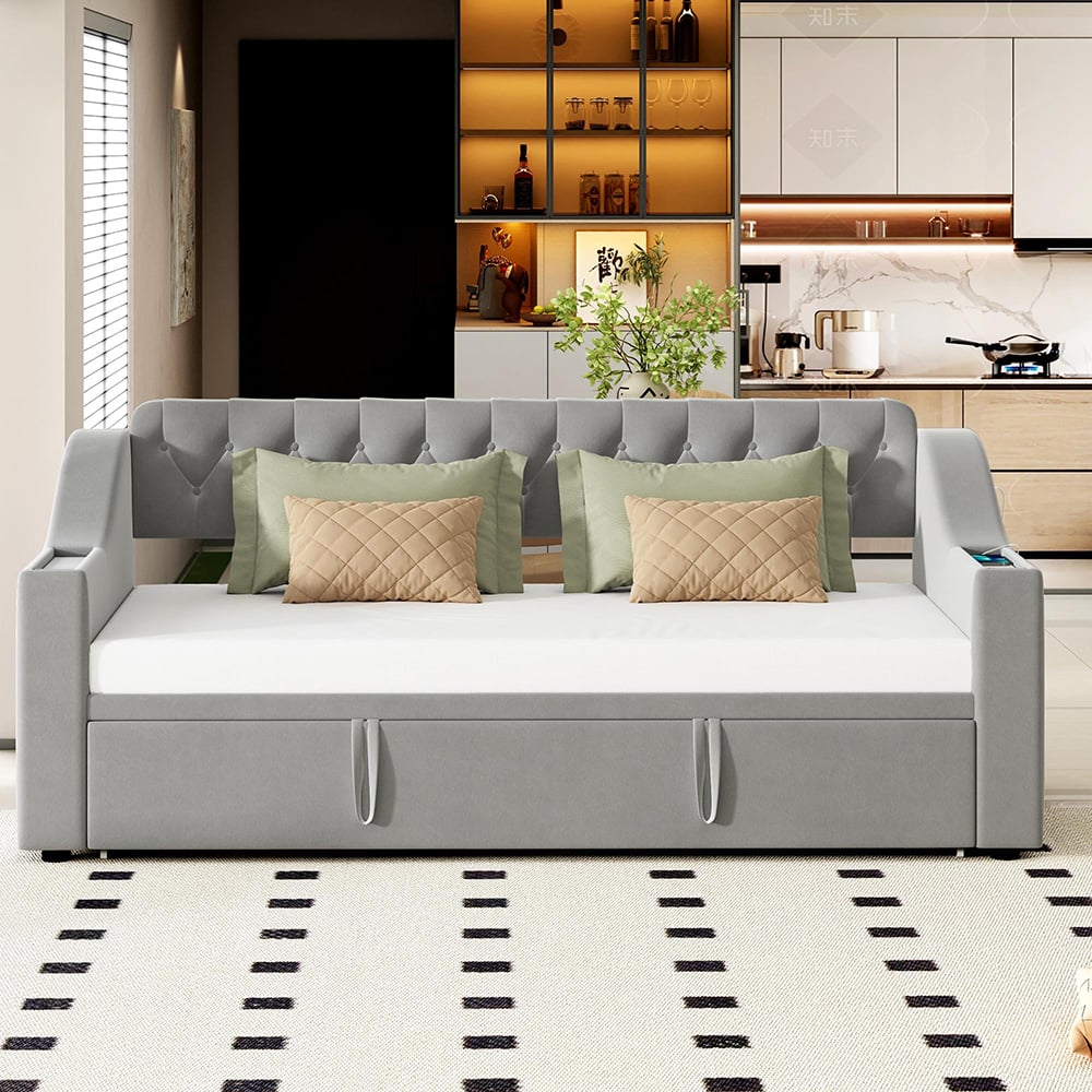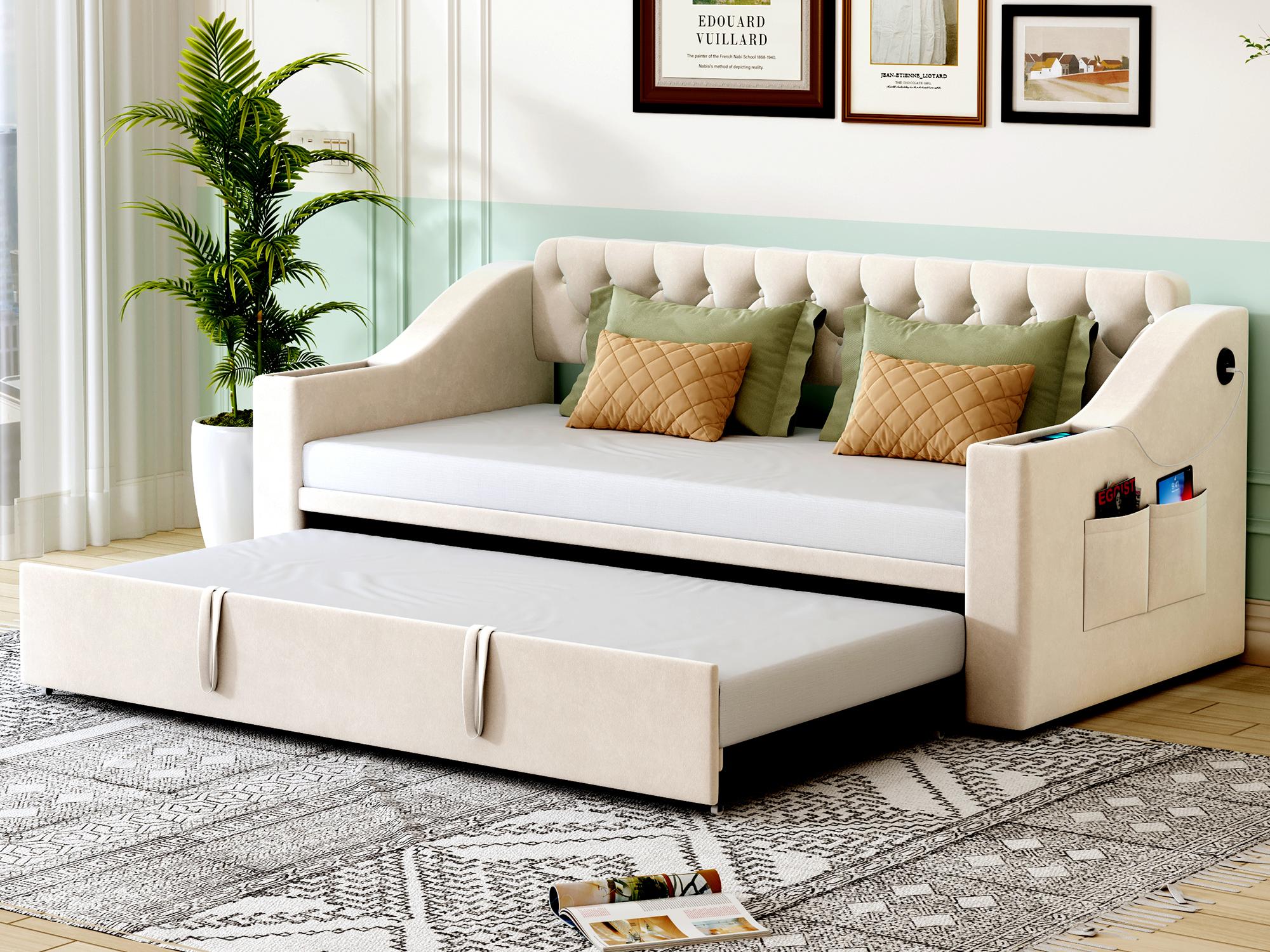 wysuwane 90/180 x 190 cm z zagłówkiem i 2 szufladami, sofa rozkładana - Aksamit - LED-y i USB, gniazda typu C - Beżowe1 686Kup!złLeroy MerlinDostawa: w Polsce Złóż skargęSpecyfikacja: Materiał łóżka: Aksamit + MDF Wymiary: 90 x 190 cm Kolor: Beżowy/Szary Liczba paczek: 2 Wymagany montaż: Tak Kraj pochodzenia: Chiny Wymi więcej→ary produktu: 202 x 96,5 x 72 cm Wymiary paczki: Proszę zapoznać się ze specyfikacją Wewnętrzne wymiary łóżka: 90 x 190 cm Całkowita wysokość: 72 cm Maksymalne obciążenie: 150 kg Zalecana grubość materaca (bez materaca): 10 cm Uwagi Ten produkt zostanie podzielony na 2 paczki Dostawa. Przesyłki nie zostaną dostarczone tego samego dnia. Jeśli nie otrzymasz całej przesyłki w ciągu trzech dni od otrzymania pierwszej, skontaktuj się z nami. W przypadku jakichkolwiek problemów z jakością prosimy o kontakt za pośrednictwem wiadomości. Ma>>>>>>>>>>>>>>>…
