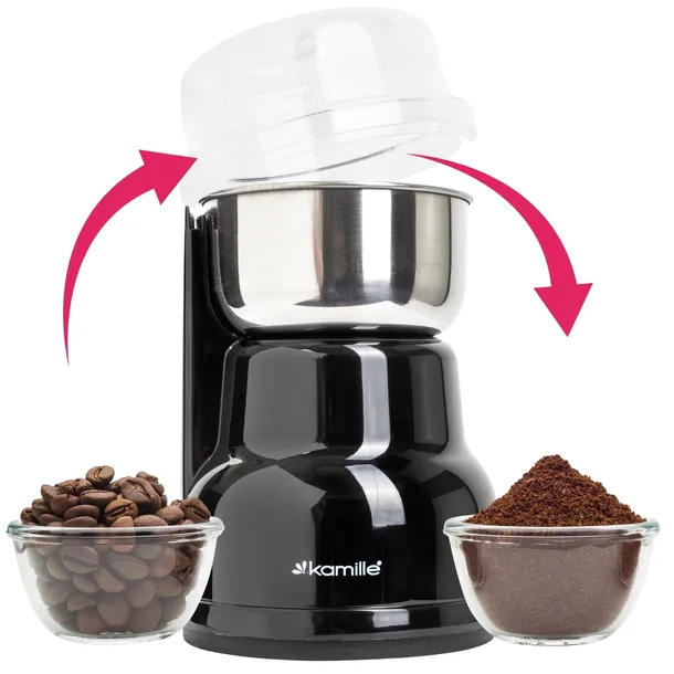 Elektryczny Młynek Do Mielenia Kawy Orzechów Mocny KamilleElektryczny młynek do mielenia kawy, przypraw 150 W KAMILLE KM-6734⭐ Przedstawiamy młynek elektryczny Kamille do mielenia kawy, orzechów, pieprzu lub innych suchych przypraw!Jesteś miłośnikiem wygody? Nasz młynek elektryczny to kompaktowe rozwiązanie dla Twojej kuchni. Mielenie kawy nigdy nie było tak łatwe! ❤️Elektryczny młynek Kamille do mielenia kawy, pieprzu lub innych suchych przypraw wykonany jest w klasycznym czarnym kolorze. W trybie pulsacyjnym kawa na 2 filiżanki będzie gotowa w ciągu zaledwie kilku sekund.Dla ułatwienia użytkowania zapewniono przezroczystą pokrywę, która pomoże kontrolować proces.Cechy produktu:solidna obudowawykonany z wysokiej 34 złErli.plZłóż skargęKup!