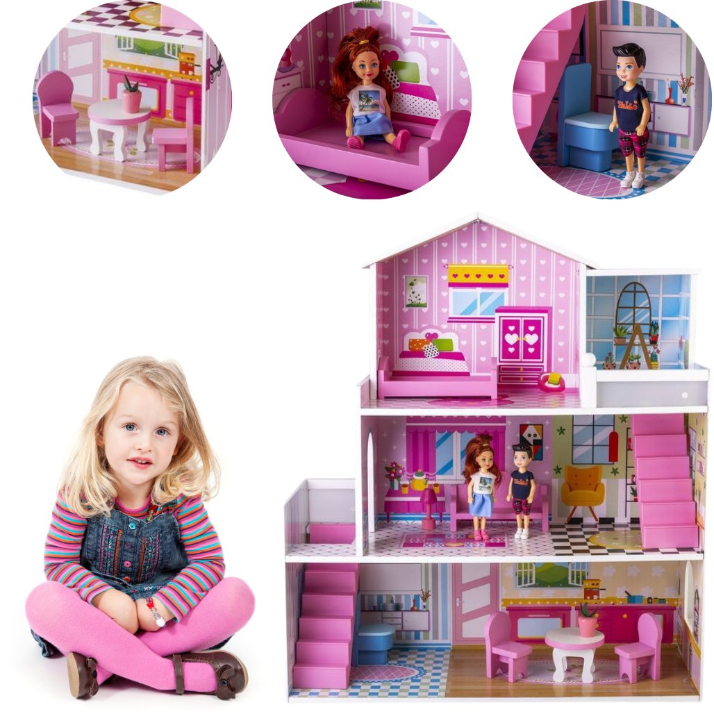 ⭐️ Nowoczesna Duża Drewniana Villa dla Lalek z Tarasem ⭐️ Domek dla Lalek w stylu LOFT Nasz trzypiętrowy domek dla lalek z zadaszonym tarasem i ogrodem to spełnienie marzeń każdego małego miłośnika kreatywnej zabawy! Zestaw oferuje ponad 20 elementów wyposażenia a solidne wykonanie oraz połączenie koloru białego, czarnego i drewna przyciąga uwagę nie tylko dziecka. Dlaczego warto? ✅ 3 piętra i ogród: Kuchnia i salon na parterze, sypialnia z tarasem na piętrze, pokój dziecięcy i łazienka na poddaszu, a w ogrodzie miejsce na grilla i zabawę z pupilem. ✅ Ponad 20 elementów wyposażenia w tym 4 figurki domowników. W zestawie znajduje się także uroczy piesek, grill czy buda. Wszystko co potrzeba by urządzić po swojemu każde pomieszczenie. ✅ Solidnie wykonany z dbałością o detale gwarantuje trwałość a połączenie kolorów białego, czarnego i drewna doskonale pasuje do rożnych stylów i przyciąga wzrok nie tylko dziecka. ✅ Ściany ozdobione stylowymi obrazami i grafikami oraz okna dachowe, które dodają uroku i doświetlają wnętrze. Przydomowy ogródek przygotowany na grilla dla jeszcze większej frajdy. WYMIARY: ✔️ Domek: 63 x 30 x 80 cm (szer./gł./wys.) ✔️ Wielkość figurki rodzica: 8 cm ✔️ Wielkość figurki dziecka: 5 cm ✔️ Wysokość parteru: 24 cm ✔️ Wysokość I piętra: 22 cm ✔️ Wysokość II piętra (do najwyższego punktu): 27 cm INFORMACJE DODATKOWE: • Zabawka zapakowana w piękne kolorowe opakowanie do samodzielnego montażu. Instrukcja w zestawie. • Idealny pomysł na prezent dla dzieci od 3 roku życia. • Wymiar opakowania: 55 x 14 x 69 cm • Waga: 11 kg