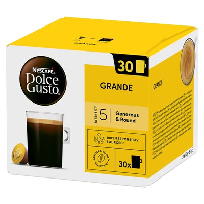 Odkryj NESCAFE Dolce Gusto Grande, składającej się z ziaren 100 % Arabica z intensywnością 5 na 11. Idealnie pasuje do długiej szklanki 230 ml.