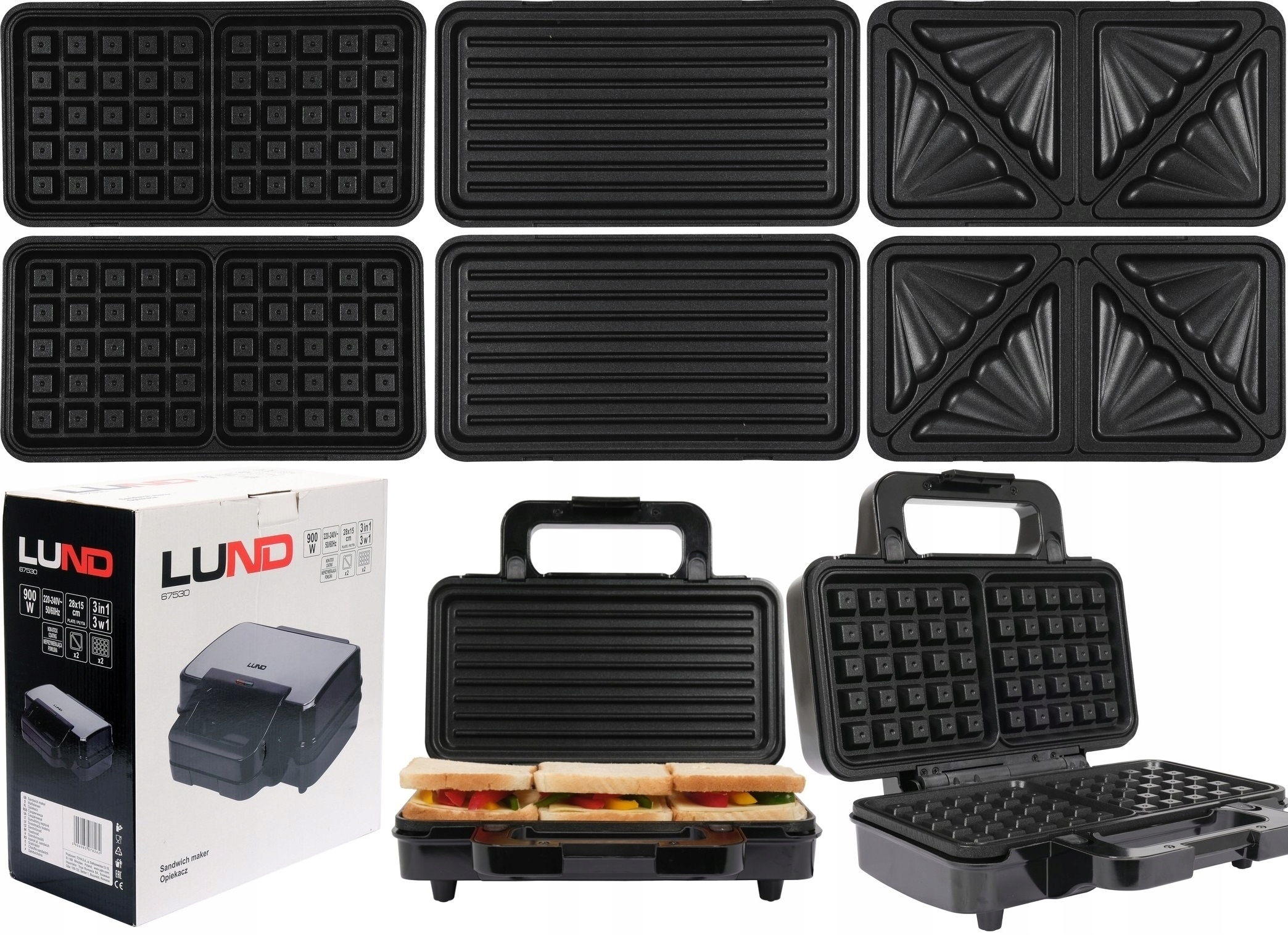 Lund Gofrownica 3w1 Grill Opiekacz Toster Kanapek Opiekacz 900W 3 Płyty GrilloweOPIEKACZ 900W 3W1 XXL, PŁYTY GRILLOWE, DO TOSTÓW I DO GOFRÓW LUND 67530 Duży i wydajny opiekacz 3w1 marki LUND. Z trzema wymiennymi płytami - do tostów, gofrów i do grillowania. Nieprzywierające powłoki zapewniają równomierne opiekanie i łatwe zdejmowanie jedzenia z płyt grzewczych. Duża płyta 28x15cm umożliwia przygotowanie większych tostów niż w tradycyjnym, tańszym opiekaczu. Informacje: - Moc: 900W 220-240V 50/60Hz - 3w1 - wymienne płyty do tostów, płyty grillowe i płyty do gofrów zwiększają możliwości kulinarne oraz ułatwiają mycie. - Kształt tostów: trójkąty - Powierzchnia płyt 28 x 15cm (w tańszych i mniejszych modelach dostępnych na rynku jedynie około 21x13) >>>>>>>>>>…Ціна від 137 złПорівняти ціни та купити Lund Gofrownica 3w1 Grill Opiekacz Toster Kanapek Opiekacz 900W 3 Płyty Grillowe Allegro (Польща) →137 złAllegro (Польща) →140 złПорівняти ціни2→