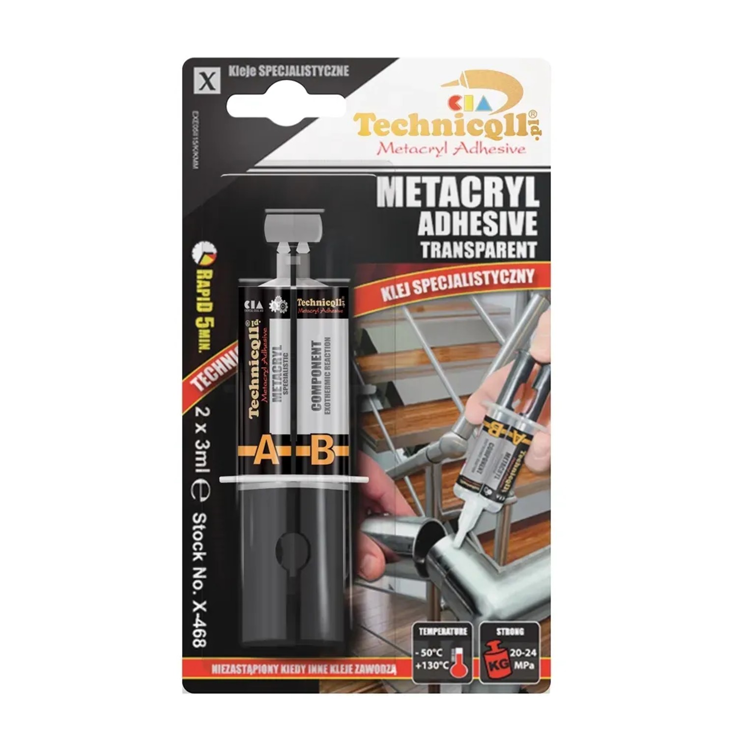| Klej Technicqll metaakrylowy 2x3 ml Klej metakrylowy marki Technicqll przeznaczony do bardzo szybkiego łączenia wszystkich twardych, miękkich, termoplastycznych tworzyw sztucznych: PVC, ABS LMR, GKF, PC, PET, PBT, akrylu (PMMA), poliuretanu, epoksydów, kompozytów itp. Nieodzowny w trwałym i bardzo mocnym łączeniu stali nierdzewnej, a także innych metali i ich stopów. Bardzo dobry do klejenia kamienia, ceramiki, szkła, drewna, ferrytu, węgla, itp. Klei wszystko poza PP, PE, PTFE. Bezbarwny, elastyczny, wodoodporny, odporny na uderzenia i wstrząsy, nie przewodzi prądu elektrycznego. Nie pęka i nie kurczy się. Odporny na UV, agresywne czynniki chemiczne (rozcieńczone kwasy i zasady, większość rozpus… | |