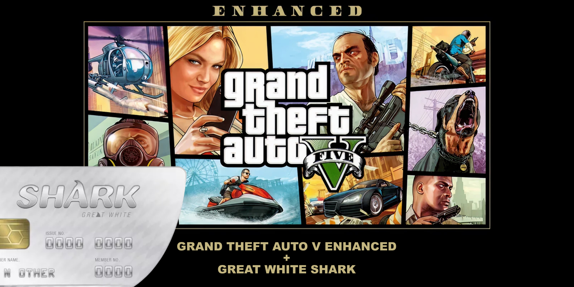 Grand Theft Auto V Enhanced + Great White Shark Edition EU185Купити!złGamivo.comДоставка: по Польщі ПоскаржитисьKey features: Iconic story of three characters: Michael, Trevor, and Franklin, Massive open world,