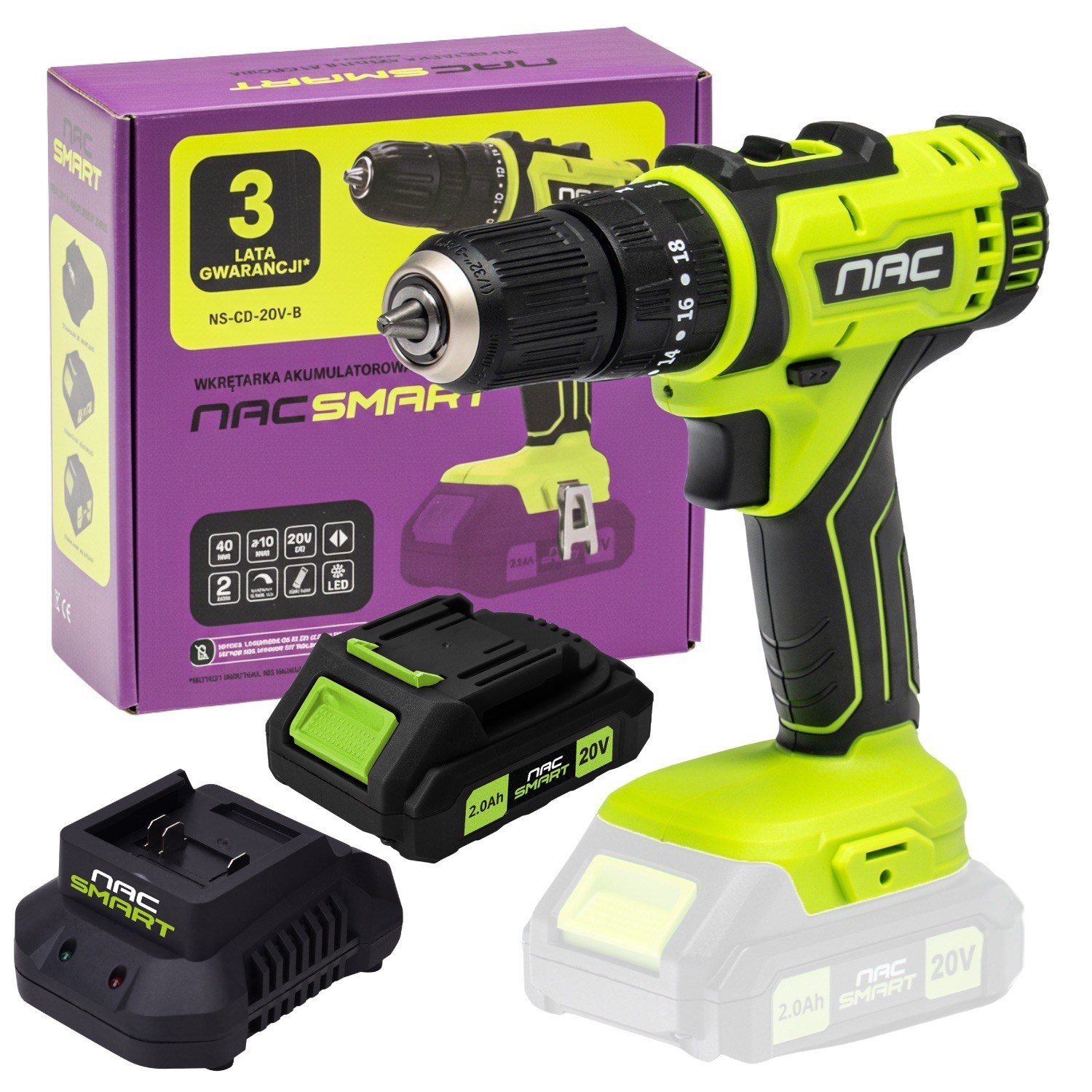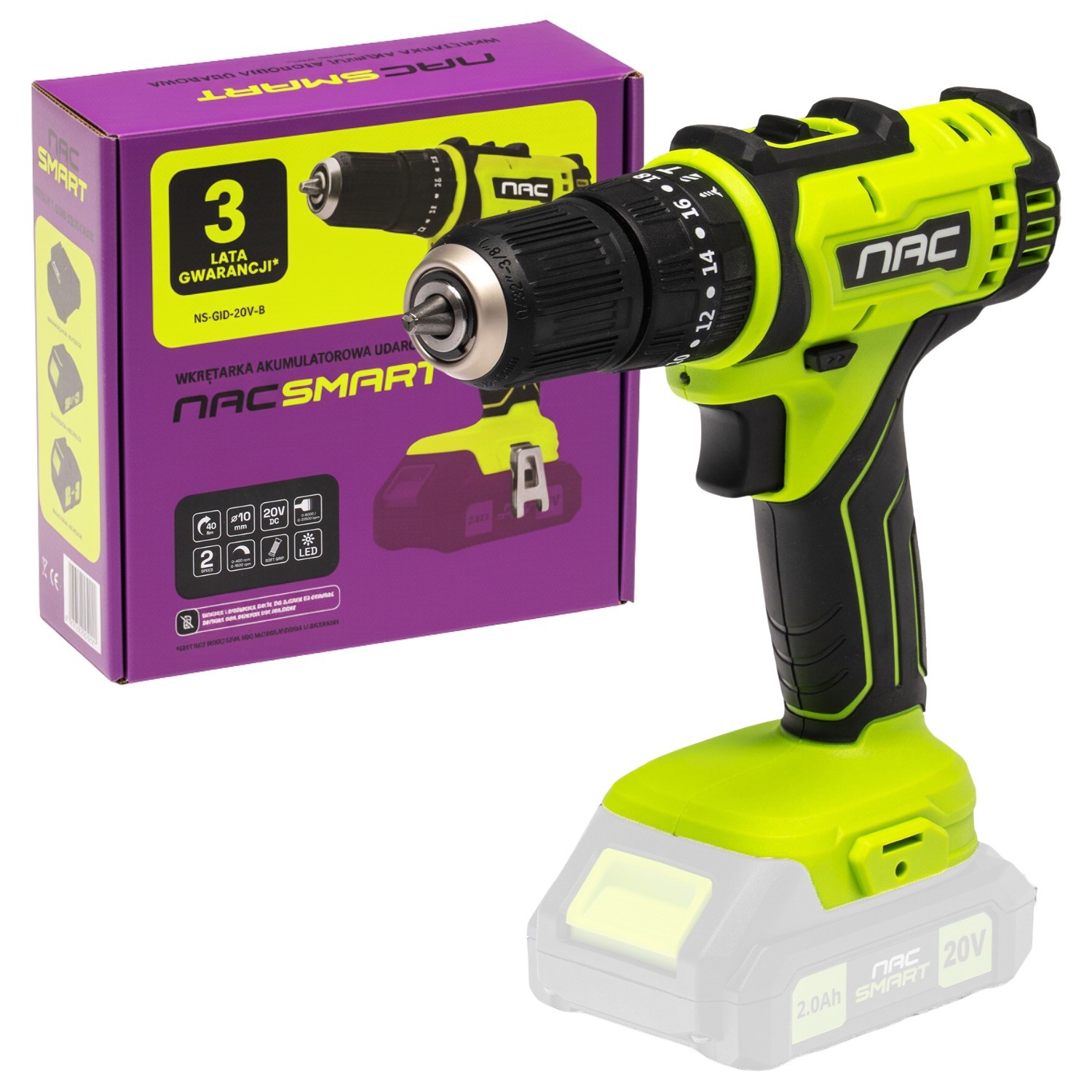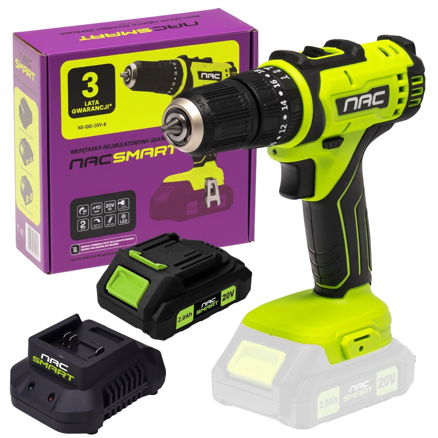 Wkrętarka akumulatorowa 20V 40Nm NAC SMART NS-CD-20V-B Body bez bateriiWkrętarka akumulatorowa NAC SMART BODY BEZ AKUMULATORA I ŁADOWARKI ⭐ Pracuj mądrze, a nie ciężko - wybierz NAC i działaj SMART ⭐ Wkrętarka NAC NS-CD-20V-B łączy w sobie moc, wszechsronność działania oraz komfort użytkowania. Idealna zarówno dla majsterkowiczów, jak i profesjonalistów. ► Postaw na jakość i zyskaj pewny sprzęt na lata - Typ silnika: elektryczny, szczotkowy, z miedzianym uzwojeniem - Maksymalny moment obrotowy: 40 Nm - Maksymalna średnica bitów: 10 mm - Ustawienie momentu obrotowego: 18 pozycji + 1 - Prędkość obrotowa bez obciążenia: bieg I: 0-400/min; bieg II: 0-1500/min - Klasa energetyczna: 79 złTopmarket.plПоскаржитисьКупити!