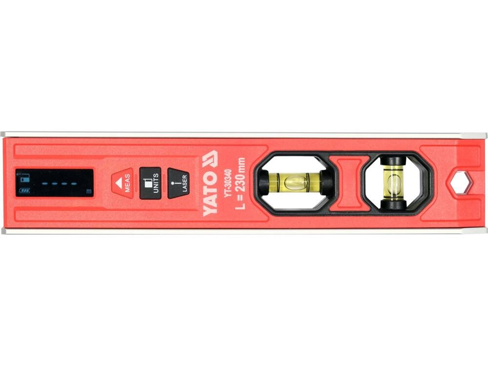 Yato Poziomnica poziomica elektroniczna 230mm torpedo dalmierz laserowy 0.28kg YT-30340Elektroniczna poziomnica torpedo 230 mm z laserem służącym do pomiarów odległości oraz wyznaczania linii poziomej lub pionowej. Dalmierz może pracować w trybie stacjonarnym lub dynamicznym (zmiana odległości w czasie pomiaru). Możliwość pomiaru od czoła lub tylnej krawędzi. Wyniki wyświetlane są na ekranie LCD. W górnej płaszczyźnie obudowy wycięty jest rowek (pryzma). Poziomnica ma dwie szklane libelle, które można podświetlać niezależnie od siebie. W podstawie zamontowane są 3 silne magnesy. Korpus wykonany z kształtownika aluminiowego, obudowa z ABS. dokładność lasera: ± 3 mm / 0.5-20 m laser: klasa 2, kolor czerwony automatyczne wyłączenie po 3 min temperatura pracy: 10 do 40 ˚C zasilani…Ціна від 144 złПорівняти ціни та купити Yato Poziomnica poziomica elektroniczna 230mm torpedo dalmierz laserowy 0.28kg YT-30340 Rotor1.pl →144 złMorele.net (Польща) →160 złПорівняти ціни2→